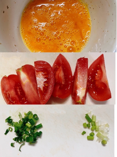 トマト 1個、 たまご 2個、 小葱 1本、 油 おおさじ1 、塩 少々、 砂糖 少々